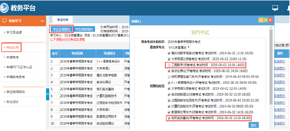 2、默认约考的顺序为:本学期的正考课程、以往学期的缺考课程、以往学期的未通过课程。