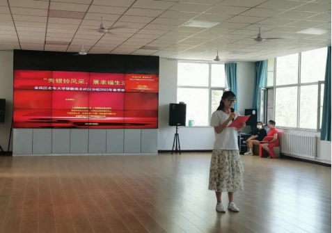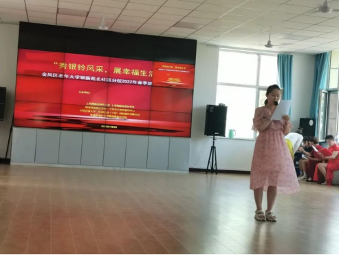 为丰富辖区老年人的精神生活,创建学习型社会、加强精神文明建设和构建,宁夏开放大学、宁夏社区教育指导中心在银新苑北社区教育示范点,联合金凤区老年大学银新苑北社区分校、银新苑北社区居委会、社创空间(宁夏)创业服务有限公司、银川寸草心社会组织服务中心,于7月8日上午,开展了“秀银铃风采,展幸福生活”文艺汇演,辖区周边100多名居民观看了演出。