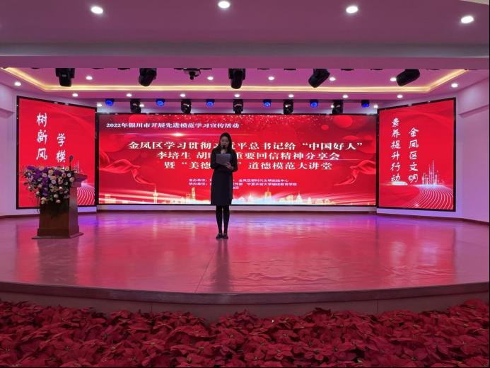 在中心宣讲现场,“中国好人榜”张望梅;“宁夏好人”王欢;“宁夏好人”李红彩;“银川好人”宋有志;“最美金凤人”贾文贵,五位道德模范代表进行现场宣讲。他们用质朴的语言和真挚的情感将个人事迹和感人的故事分享给大家,引导在场群众自觉践行社会主义核心价值观,争做做道德风尚的倡导者和引领者,有力地传播了道德模范的榜样力量。