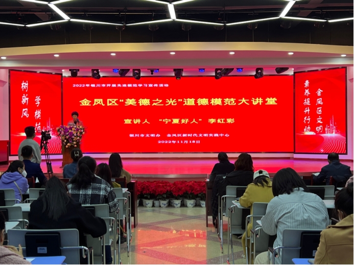 为扎实开展2022年全民终身学习活动周活动,深化落实我区居民文明素养提升行动,不断深化公民道德实践。2022年11月18日下午,宁夏社区教育指导中心与金凤区新时代文明实践中心联合举办社区居民文明素养提升行动系列活动——“美德之光”道德模范大讲堂主题活动,邀请辖区“中国好人榜”“宁夏好人”“银川好人”“最美金凤人”等5名各级道德模范开展先进事迹宣讲,持续加强道德模范、“身边好人”等道德建设先进典型宣传力度,进一步激励群众向上向善、见贤思齐。