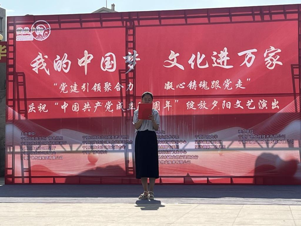 为庆祝中国共产党成立103周年,宁夏社区指导中心等单位协同新银社区举办了一场主题为“党建引领聚合力 凝心铸魂跟党走”的文艺演出活动。通过丰富的文化表现形式,展现社区居民的才艺,增强党组织的服务功能,提升居民的幸福感,让社区文化更加绚丽多彩,新银社区党支部书记谢春燕在开幕式上致辞。