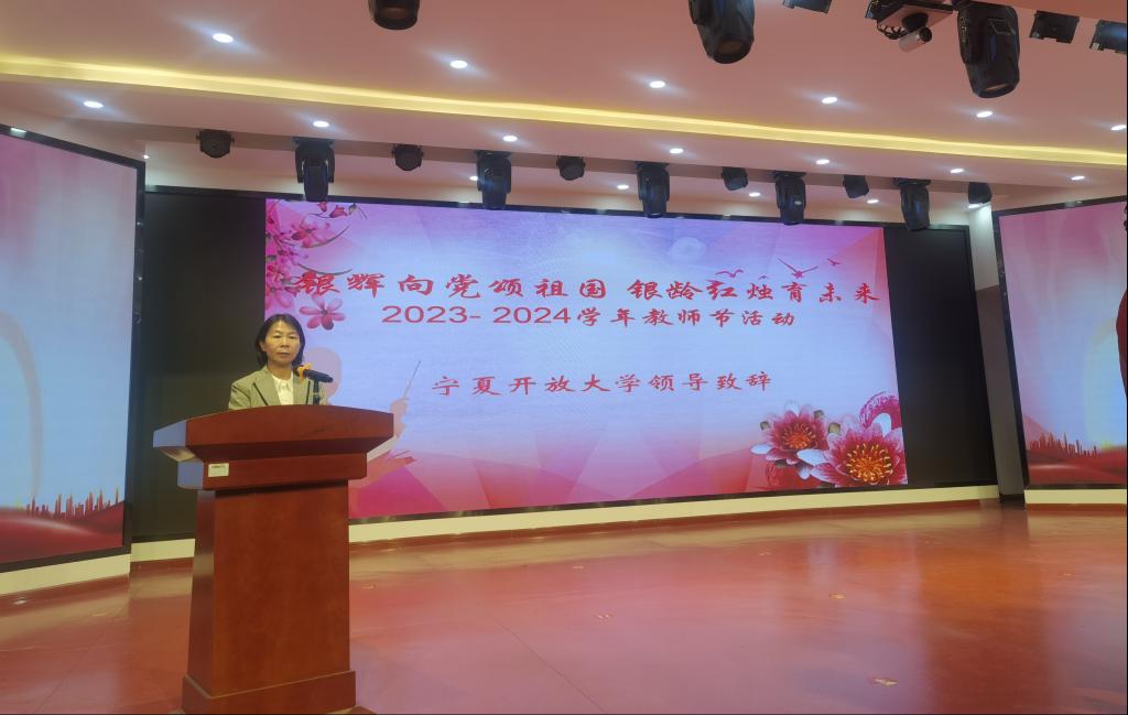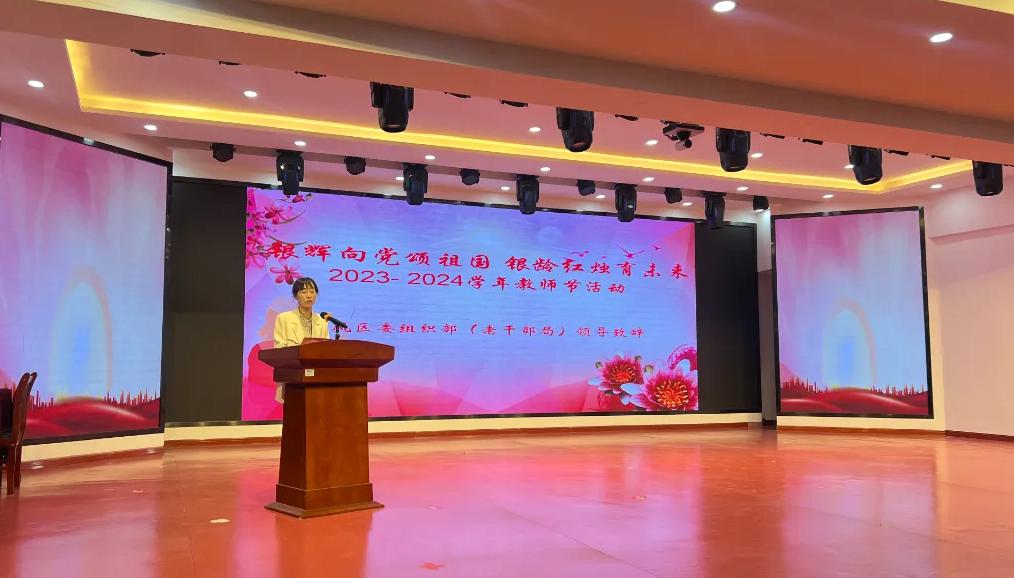 为大力弘扬教育家精神,展示老年教育教师立德树人的精神风貌,营造全社会重视老年教育的浓厚氛围,团结凝聚广大教师以更加奋发有为的精神状态投身老年教育建设实践,在第40个教师节来临之际,9月6日下午,由宁夏开放大学、金凤区委组织部主办,宁夏开放大学365英国上市公司、金凤区老年大学承办的“银辉向党颂祖国 银龄红烛育未来”教师节表彰活动在金凤校区社区教育体验中心举办,金凤区委组织部副处长李娟、365英国上市公司、金凤区老年大学及各社区分校教师代表、文艺志愿服务队等近百余人参加活动。