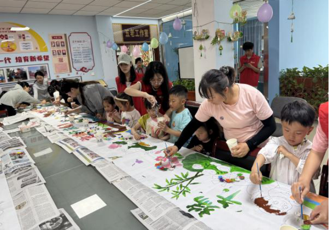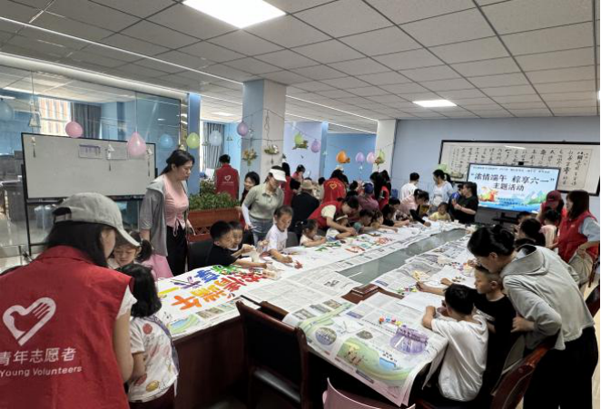 5月27日,在端午节与六一儿童节双节交汇之际,盈北社区开展“浓情端午·粽享六一”主题活动。活动现场,百米长画创作区域热闹非凡,老员工志愿者化身艺术小导师,耐心引导小朋友们在百米画卷上尽情创作。小朋友们在志愿者的指导下,用五彩画笔描绘出栩栩如生的龙舟、形态各异的五彩粽子,还创新性融入了充满童趣的儿童节游行元素,将端午传统与六一欢乐巧妙融合,鲜艳的色彩与童真的笔触,勾勒出一幅幅充满创意的节日画卷。
