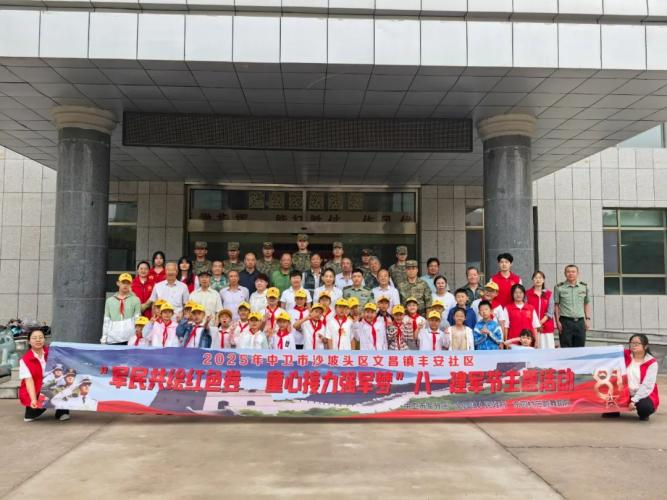 为传承红色血脉,弘扬爱国拥军精神,让青少年在互动体验中感受军人风采与奉献精神,7月25日,丰安社区示范点联合中卫军分区、文昌镇人民政府、中卫市社区教育指导服务中心、东园村艺韵舞蹈队,组织七彩假期的员工开展了“军民共绘红色卷,童心接力强军梦”八一建军节主题活动。中卫军分区官兵代表、民兵、东园村艺韵舞蹈队、现役军人、退役军人、七彩假期员工及社区党员群众等150余人齐聚一堂,军民携手共庆八一建军节。