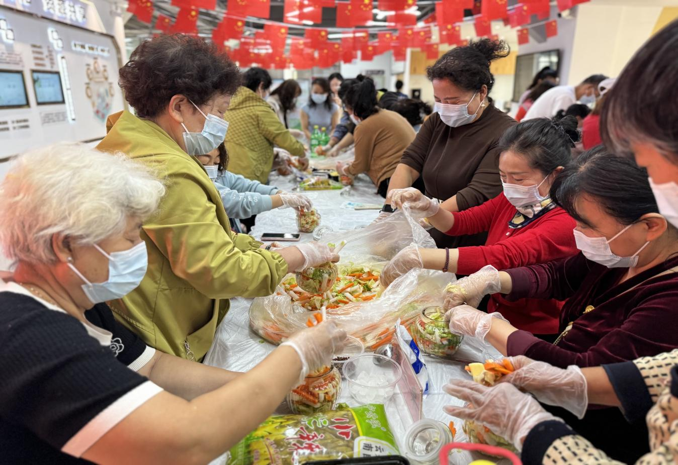 活动现场,来自汉族、回族、朝鲜族、维吾尔族等多个民族的居民围坐在一起,化身“美食达人”,有条不紊地处理蔬菜、调配料汁。“我们家做泡菜会加一点八角,吃起来更味道更丰富!”汉族居民范雄雁一边演示往罐子里铺菜的方法,一边热情分享自家的泡菜秘方;朝鲜族居民奇勇哲则带来了传统的腌制手法,详细讲解如何把控盐和发酵时间,让泡菜既保留清脆口感,又充满独特风味;蒙古族居民马亮还特意带来了自家制作的特色酱料,共同交流各民族的饮食文化……现场没有民族之分,只有邻里间的互助与分享,每个人的脸上都洋溢着幸福的笑容,空气中弥漫着蔬菜的清香与团结的温暖。