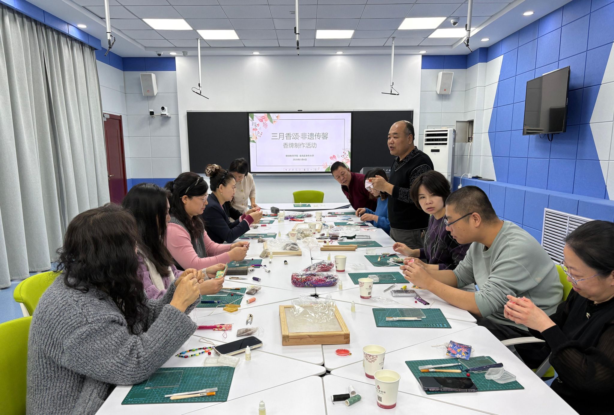 春风送暖,芬芳将至。在“三八”国际妇女节来临之际,为丰富教职工精神文化生活,传承非物质文化遗产,在共同体验中增进文化认同,3月6日下午,365英国上市公司联合金凤区老年大学,在社区教育体验中心二楼智慧教室共同举办了“三月香颂·非遗传馨”中药香牌手工体验活动。365英国上市公司全体教职工与金凤区老年大学工作人员代表欢聚一堂,共赴一场融合药香、手艺与情谊的春日雅集。