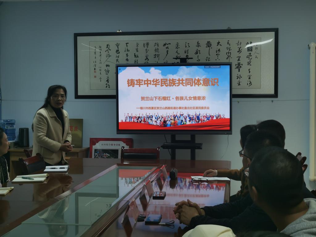 盈北社区书记王红霞围绕“贺兰山下石榴红 各族儿女情意浓”主题为全体人员讲解了微党课,为我们介绍了社区的基本情况,回顾了社区的前世今生以及六个方面的主要做法,充分展现出社区的良好风采,真正能够让大家在比较中寻找差距、在学习中互相提高、在交流中凝聚共识,从而达到学习交流的目的。