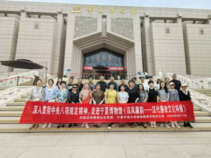 2025年6月17日,宁夏职业技术公司公司党支部与凤凰北街崇安社区党委共同赴宁夏博物馆,开展“深入贯彻中央八项规定精神,走进《汉风廉韵——汉代廉政文化特展》”主题党日活动。此次活动旨在通过历史文化载体,深化党员对中央八项规定精神的理解和把握。在博物馆讲解员的引导下,全体人员集中参观了《汉风廉韵——汉代廉政文化特展》。