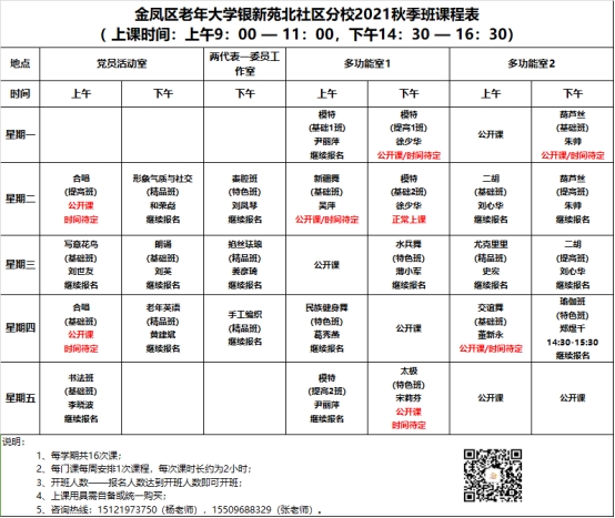 金凤区老年大学银新苑北社区分校2021年课程表