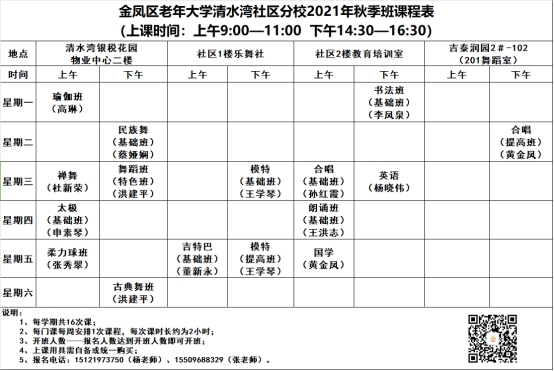 金凤区老年大学清水湾社区分校2021年秋季班课程表