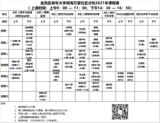 金凤区老年大学清水湾社区分校2021年春季班课程表