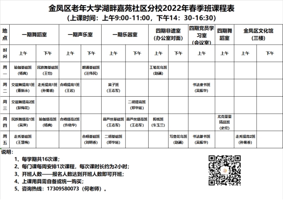 金凤区老年大学湖畔嘉苑社区分校2022年春季班课程表