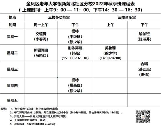 金凤区老年大学银新苑北社区分校2022年秋季班课程表