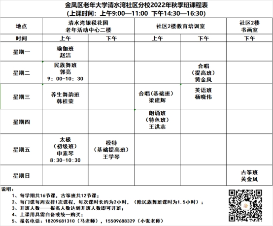 金凤区老年大学清水湾社区分校2022年秋季班课程表