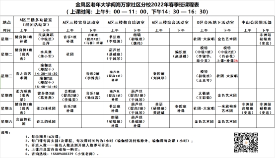 金凤区老年大学清水湾社区分校2022年春季班课程表