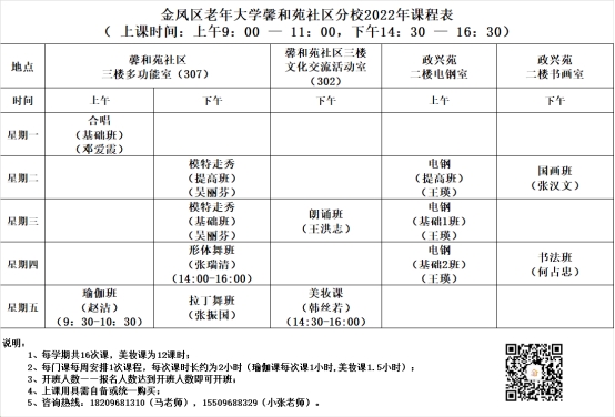 金凤区老年大学馨和苑社区分校2022年课程表
