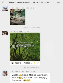 不止有微信群的交流,更是有着线上直播课,黄建斌老师所带的英语研修班是第一个开通线上网课教学的班级。从3月29日开始,每周五上午9点——11点,学员们准时打开手机聆听黄老师的讲课,黄老师耐心细心地给学员们上课,遇到需要延伸拓展的单词、语句,还会耐心的拼写出来,让每位学员都能记在书上。课后宋班长也会积极主动分享课堂笔记,大家相互学习补充完善。